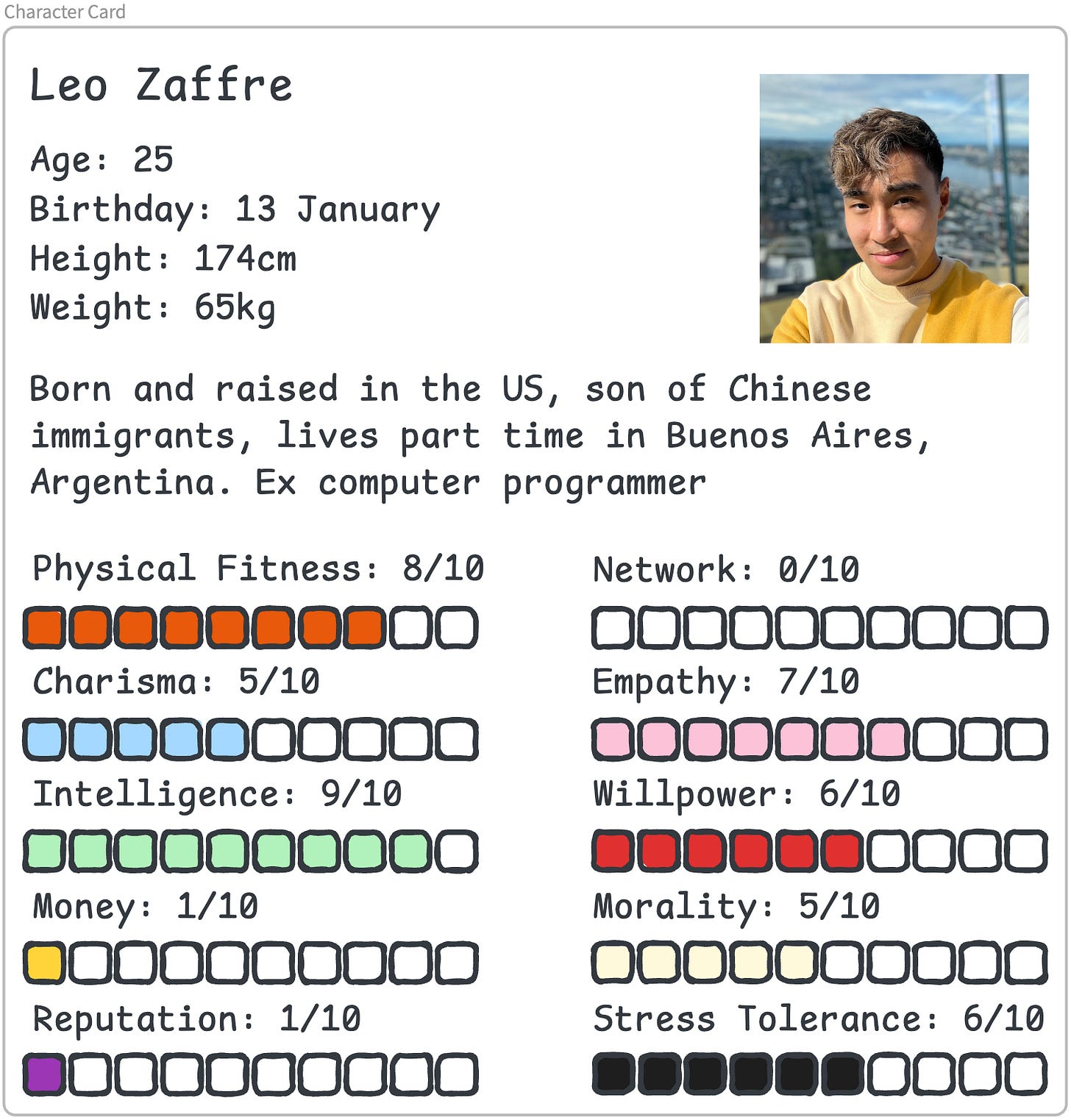 I really like the idea of a "Character Card".