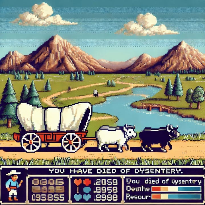 When I was a kid, I loved to play Oregon trail on the school computers. You play as a wagon leader and your mission is to move your caravan westward— to the Oregon region. The simulation takes place in the Manifest Destiny epoch in American history.